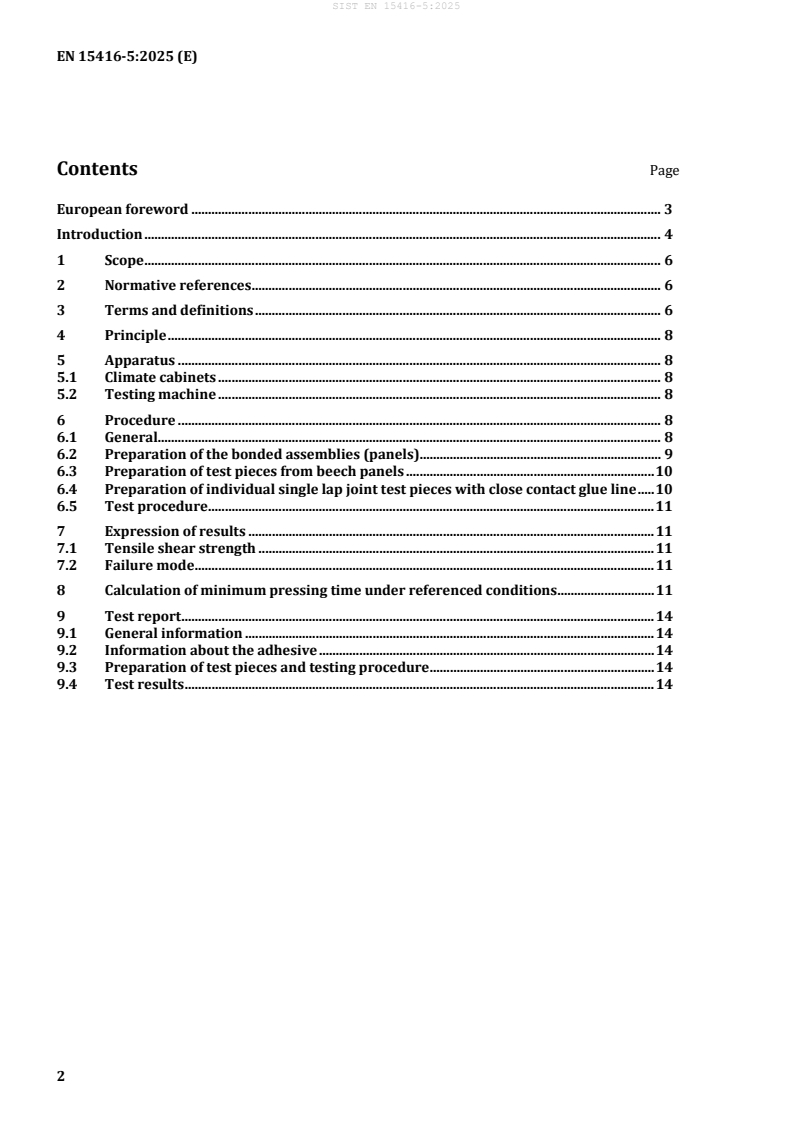 EN 15416-5:2025 - published by CEN - is a laboratory test method for adhesives for load-bearing timber structures (other than phenolic and aminoplastic). The standard defines a repeatable procedure to determine the minimum pressing time under referenced conditions for glue line thicknesses close contact, 0.2 mm, 0.3 mm and 0.5 mm. It is intended to provide a reliable basis for comparing minimum pressing times between adhesives, while noting that test results alone cannot be directly applied to safe production without accounting for real-world variations (timber density, factory temperature, RH, etc.).
