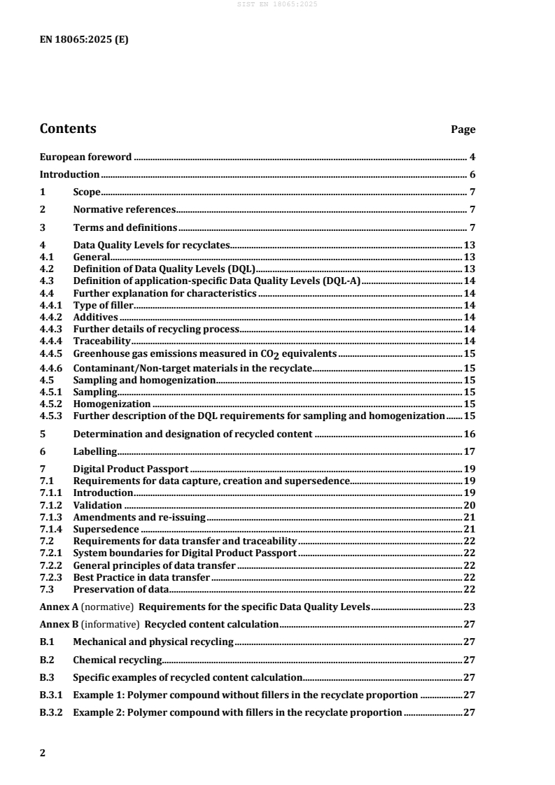 - Normative and informative annexes: Annex A defines specific DQL requirements; Annex B contains recycled content calculation examples; Annex C covers sampling guidance.