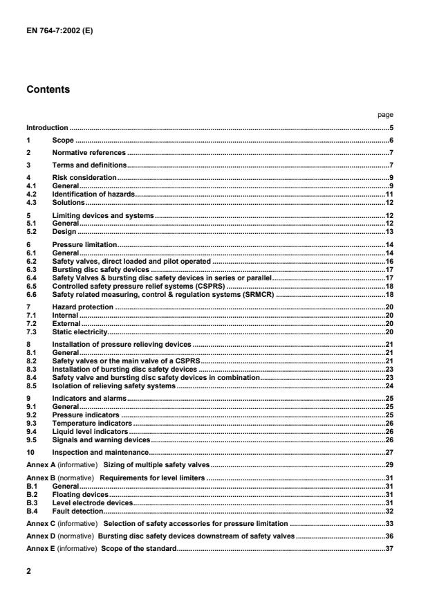 EN 764-7:2002 - Pressure equipment: Part 7 - Safety systems for unfired pressure equipment (CEN) defines requirements for complete safety systems that protect vessels, piping, accessories and assemblies from exceeding safe operating conditions. The standard applies to overpressure protection and to safety-related indicators, alarms, signals and warning devices when used as part of a safety system. It supports the essential safety requirements of the European Pressure Equipment Directive (PED 97/23/EC).