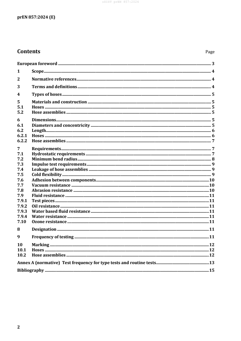 Keywords: FprEN 857, wire braid reinforced, compact hydraulic hoses, hose assemblies, hydraulic applications, ISO 6743‑4, impulse test, hydrostatic testing, minimum bend radius.