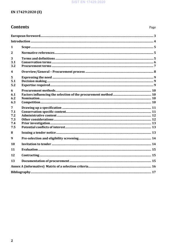 SIST EN 17429:2020 is a standard published by the Slovenian Institute for Standardization (SIST). Its full title is "Conservation of cultural heritage - Procurement of conservation services and works". This standard covers: This document outlines the principles, processes and best practice for procuring conservation services and works for cultural heritage. This can embrace any conservation action or measure, whether it be a preventive measure, a remedial treatment, investigation, planning, policy, or project management, etc. This document encompasses different routes to procurement depending among other things, on the scale of the work envisaged. This document is intended to be read alongside relevant regulations covering procurement and is technically specific to the conservation of cultural heritage. This document is not intended to override or conflict with European and national legislation covering procurement. This document is intended to be used - by commissioners of conservation work (e.g. custodians, public or private individuals, collecting institutions, conservation specialists, conservation funding organisations, etc.), and - by those individuals and enterprises seeking to carry out conservation work.